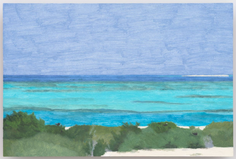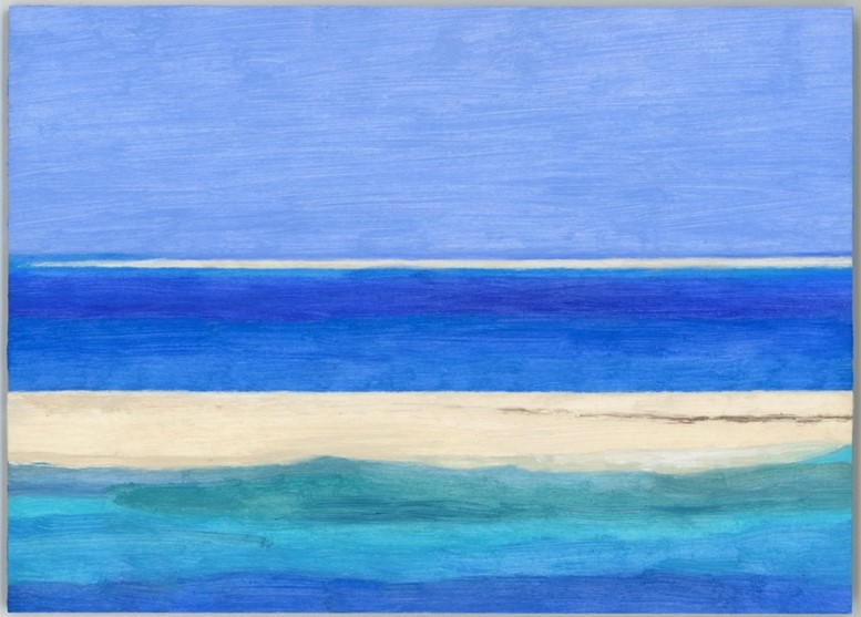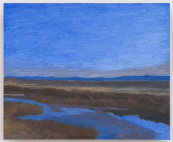 Ray uses a broad range of lapidary blues, from cobalt, to ultramarine, to aquamarine. At times, her glowing use of the color is reminiscent of Patinir, the Dutch master whose blue rocks and seemingly infinite vistas marked the beginning of landscape painting as a genre. Because most of her images are reconstructed from memory, Ray’s work is a bit dreamy, approaching but never reaching realism. Her power of recall would appear to rival the remote viewing skill of government spooks detailed to the Army’s Stargate Project.