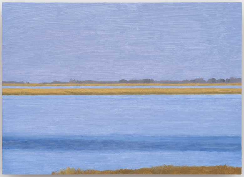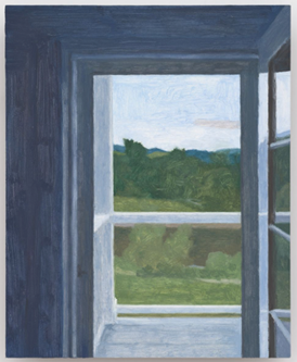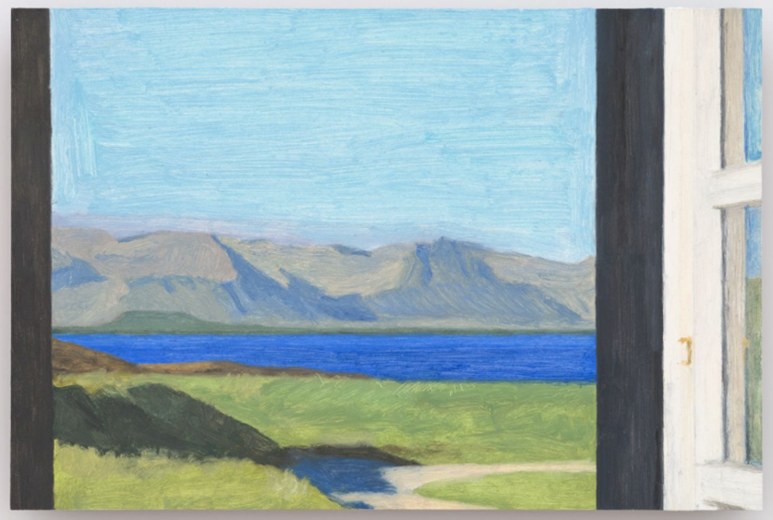 Hellnar window and Vermont door are so tenderly painted that any slight break in the direction of Ray’s super-fine brushwork becomes an atmospheric event. Because she paints on panel, her brushwork, though quiet, tends to sit visibly on the surface, with no canvas weave to sink into. She favors a lightly threaded surface and silken color lone, often manifested in flat, softly painted horizontal passages.