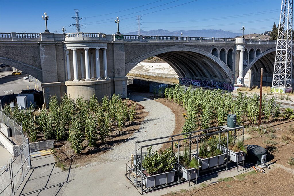 “Brackish Water Los Angeles,” on the campus of California State University, Dominguez Hills, brings the viewer—somewhat depressingly—face to face with what’s going on now. As the PST exhibition guide informs us, “South Los Angeles [is] where local rivers have been transformed into concrete channels, and where industrial contamination and ecological racism have plagued surrounding communities for generations.” (If “racism” seems like a reach, remembering that the placement of early freeways was a deliberate neighborhood segregator should mitigate any doubt.) While the exhibition itself—with contemporary artists’ tenuous takes on global warming—is a bit of a hodgepodge, there’s a beautiful but quietly disturbing video by Issac Michael Ybarra of water running down denuded hills which is perfectly on point. As is a Portable Wetland for Southern California by Lauren Bon and Metabolic Studio—a solar-powered machine for removing pollutants from water. That it’s installed in the school’s sculpture garden isn’t a reach at all: Portable Wetland is, in the vein of Mark Di Suvero, actually good-looking.