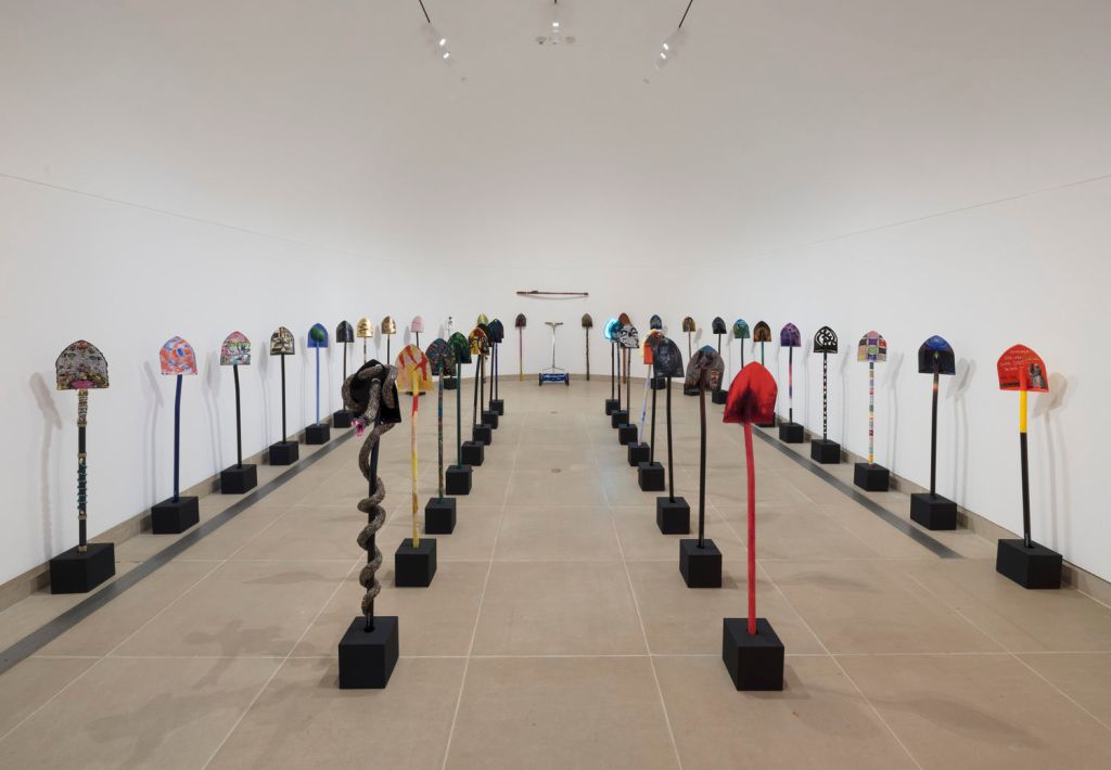 At UCLA’s Hammer Museum, “Breath(e): Toward Climate and Social Justice,” with about 100 works by contemporary artists, purports to elucidate climate change and its “inescapable intersection with issues of equity and social justice.” A large beehive inside a glass case with its denizens busily at work is a crowd-pleaser requiring monitored entrance to a darkened chamber. The installation, by Garnett Puett, is fascinating, but more as melittology than art. Closer to art-qua-art is Ron Finley’s Urban Weaponry Project, Weapons of Mass Creation (2018 and ongoing), a display of shovel heads, painted by other artists, standing upright on their handles at about eye level. The adroitly decorated shovel heads—one with a portrait of Mr. Finley, another with sculptural fang-baring snake attached—are a highlight of the exhibition. With so many PST shows seeming like socially conscious folk music festivals, the Hammer offers a veritable rock concert.