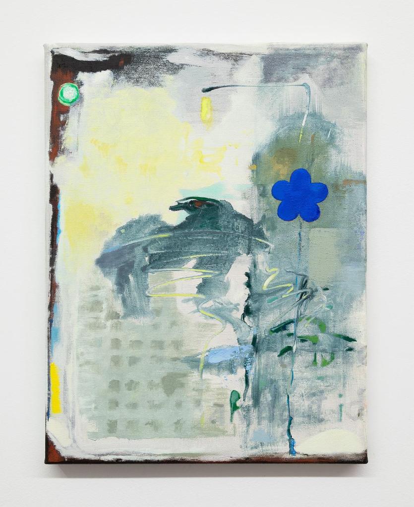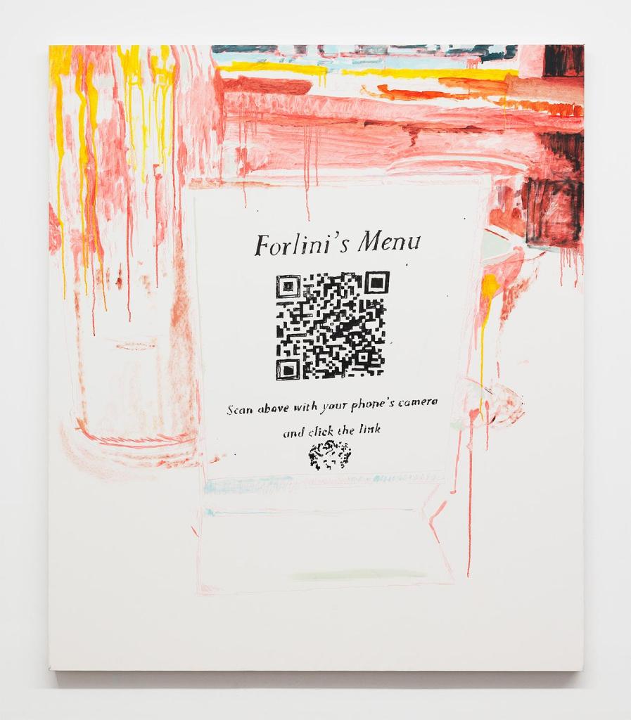 Even so, Claflin does not abjure complexity. In The Narrator, painted flowers cover the cross-section of a tree trunk, occluding its age rings and intimating human storytellers’ unreliability. Untitled (for Walter), a painting of a QR code restaurant menu, registers coy frustration with digital mediation as well as genuine tribute to a now departed eatery, not to mention her painterly chops and love of the artmaking process. In ZaZa City, a single giant flower flanking what presumably is one of the eponymous NYC weed dispensaries, shrouded in sooty fog, could be reflect both faith in and uneasiness about slackerdom. Works such as Noon, Theater, and, most explicitly, Disappear Here convey the sheer joy accompanying the fait accompli of having stubbornly opted out of the whirl for an insular moment. In the side room is Martini’s Traum, a preposterously small drum set on a bearskin rug, perhaps signifying, past the giggles, that the rec-room innocence of youth recedes with scale, which may be why some people are reluctant to go big in life.
