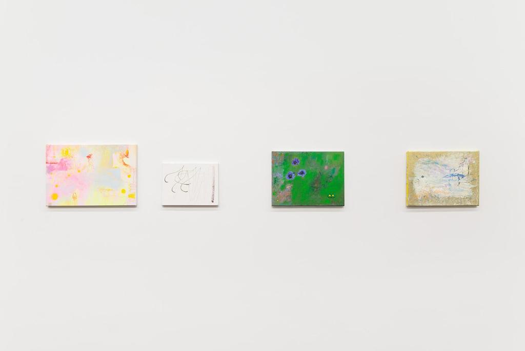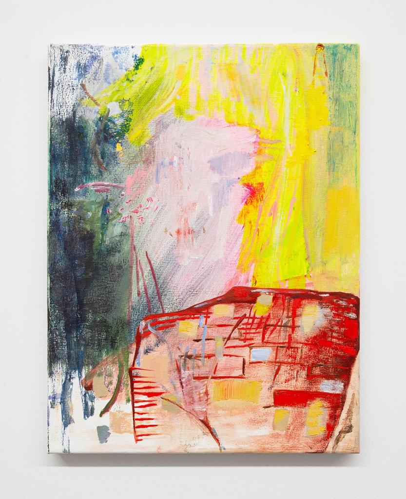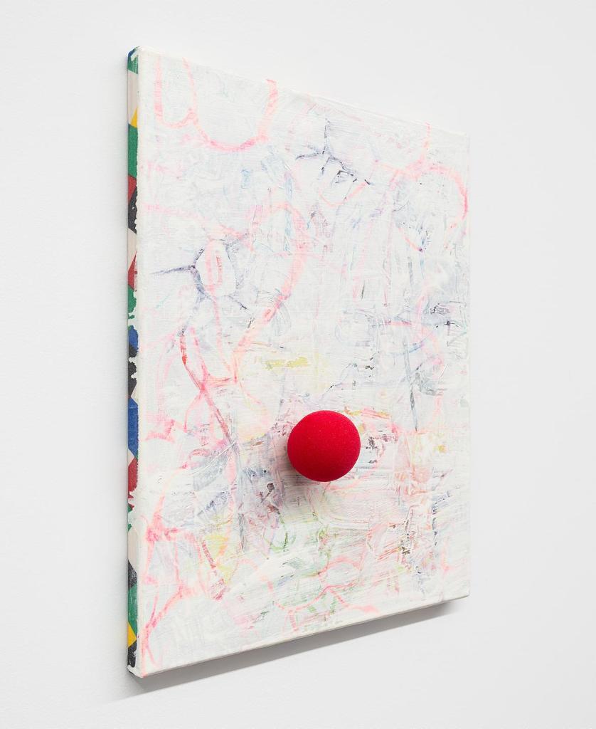 Contributed by Jonathan Stevenson / Whitney Claflin’s work, now on view in her solo exhibition “Pinky’s Where” at Derosia, is winningly deceptive, like the title’s double-entendre. Consider the paintings Emma in Tarzana and Mr. Triste. At first blush, they seem nonchalantly wise-ass and a little frustrating, the first an offhand quip about internet celebrity and influencer supreme Emma Chamberlain, and the second, featuring a found clown nose pasted onto a surface of obdurately tentative color and line, a jaunty aesthetic shrug. Look a little longer, and a considered integrity emerges in the de Kooning-esque abstract brinkmanship of the one and the measured Rauschenbergian wit of the other. Both distill the durable struggle that adults – artist and writer included – face, per Corinthians, of putting aside childish things.