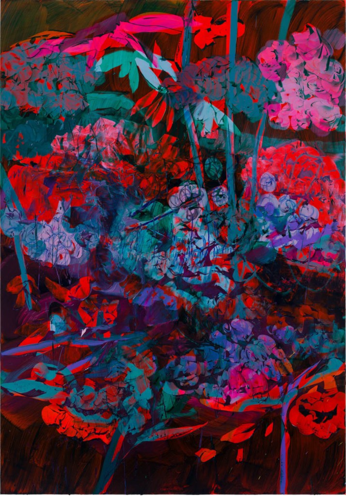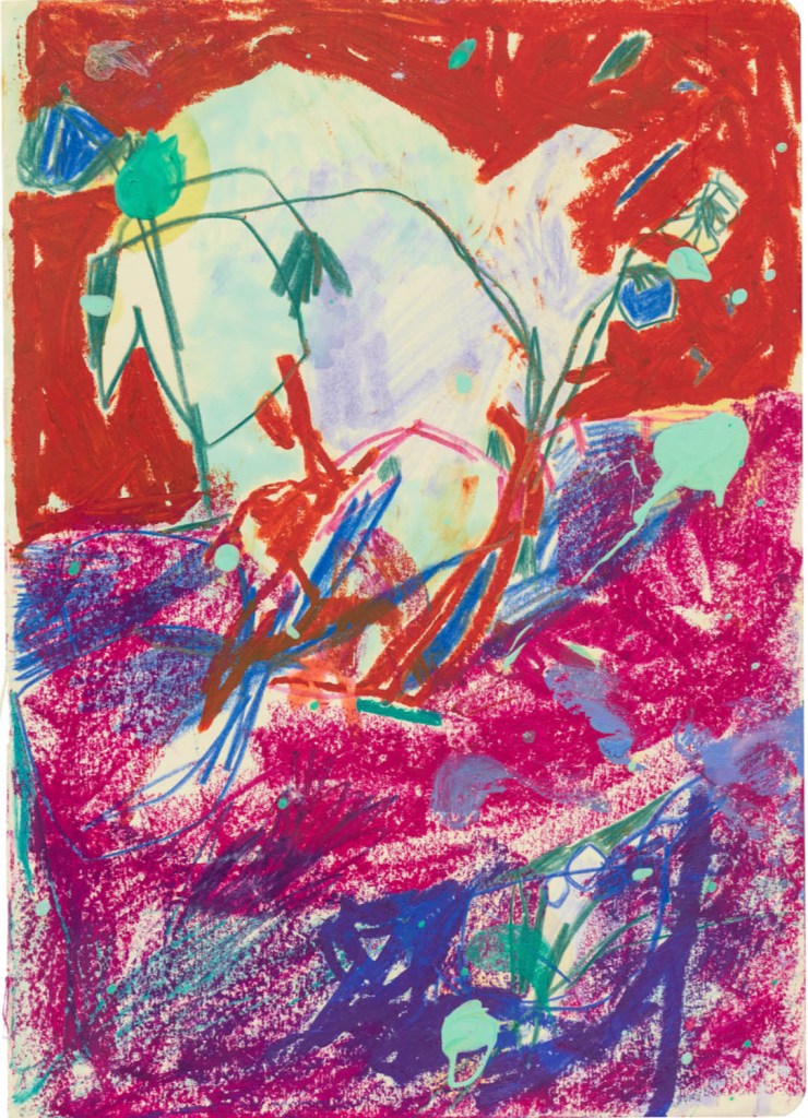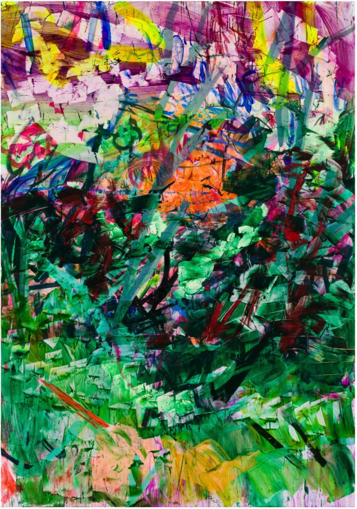She begins with strong, sometimes fluorescent, ground. Next come waves of thick paint, scraped back with a large metal spackle knife, for larger canvases affixed to the end of a pole. This forms malachite-like whorls, clouds, and scoops. Then come fast, wild lines in oil pastel and finally impasto globs, opaque fields of color, and large liquescent strokes. Fadojutimi can reorder or interleave these steps in pursuit of the image. But none of her huge, often magnificent paintings look at all overworked. Although Fadojutimi’s palette is gloriously equatorial – her lineage is Nigerian – she cites Japanese anime as her greatest influence. It shows. Anime isolates action in still frames, energizing it with splashes of color. As Fadojutimi slides her brush to a halt among garlands and shattered kanji marks, lit paths and bunches of hothouse flowers emerge.