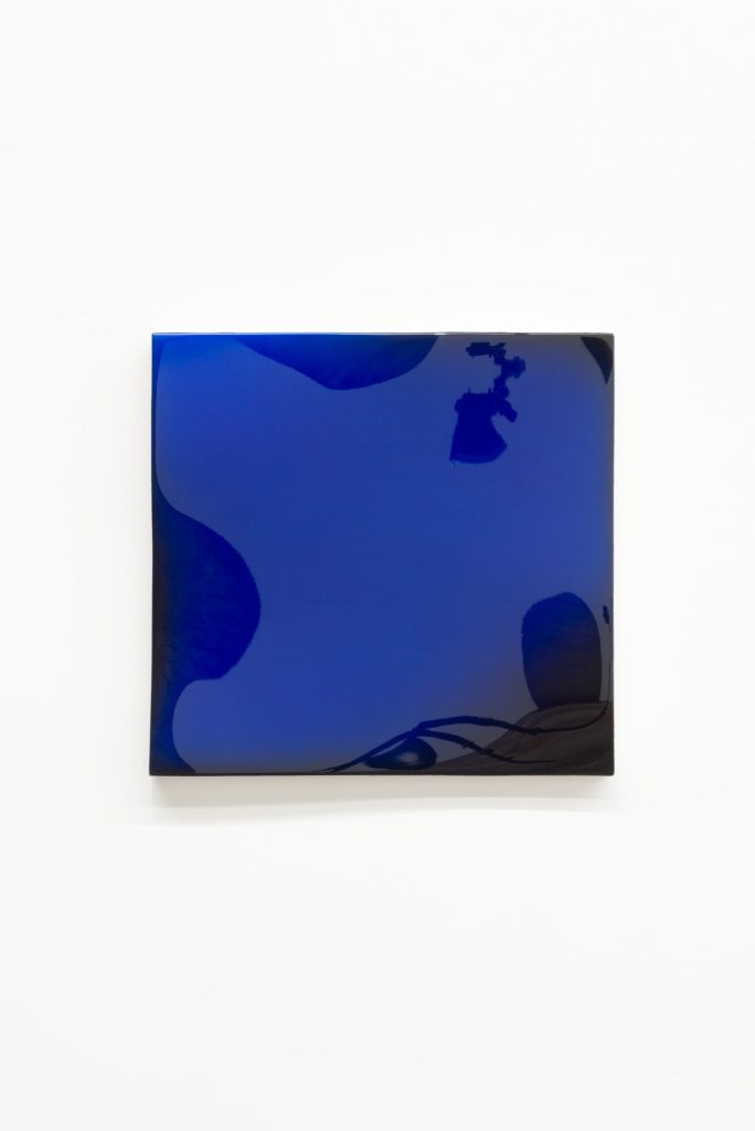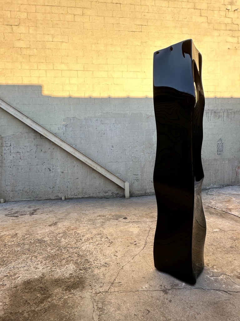 The new work reflects a very deliberate shift from what was on display in the last show of Vincent’s I saw with my eyeballs: “Hi-Fi Chassis” at Leo Koenig Inc. in 2011. Gone are the text and the slick, seemingly bejeweled objects of pop and car culture. Replacing them are more abstract undulating waves of canvas covered with paint and many coats of clear, showroom-polished to create a surface with slight variations of color and visceral smoothness that cause distorted reflections to dance as we move past the objects.