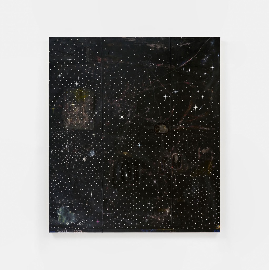 Contributed by Sharon Butler / Chris Martin is deep into a nearly five-decade-long artistic odyssey fueled by an unrelenting passion for process, spontaneity, and embracing the unexpected. His prolific energy, both physical and creative, melds into his broad knowledge of painting history and an insatiable desire to share his thoughts, feelings, and vast collection of everyday ephemera and small objects by embedding them in paint on canvas. Martin’s paintings are bursts of assemblage showcasing the power of proximity – vibrant cacophonies of glitter, pages ripped from textbooks books, magazine remnants, letters, and newspaper clippings. “Speed of Light,” his second solo exhibition with Timothy Taylor, draws inspiration from the dark night sky in the Catskills, inflecting profound questions about the universe with a comedian’s flair for the seriously absurd. The results are thought-provoking, funny, and, at times, ecstatic.
