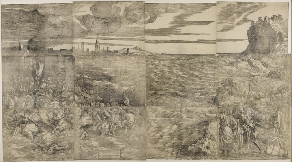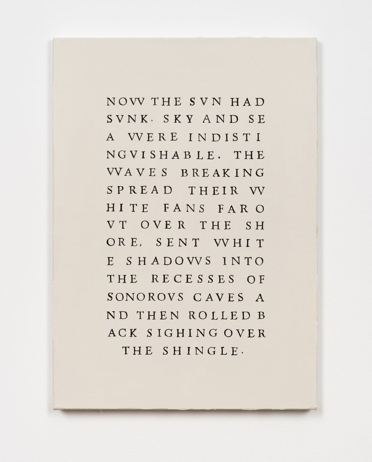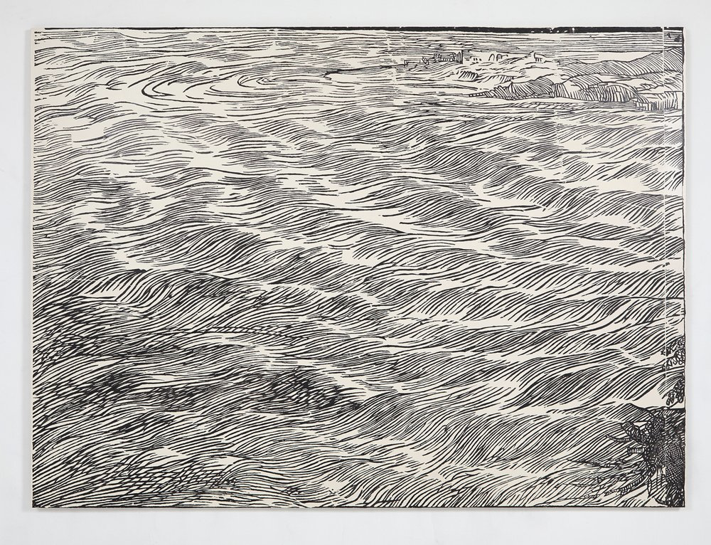The centerpiece of the show is the large painting Portent. This oceanic depiction of waves was lifted from the seemingly sparse central panel of Titian’s gargantuan 12-part woodcut The Submersion of the Pharaoh’s Army in the Red Sea, from 1515. The story, from Exodus, is about the drowning of Pharaoh’s army, Biblical persecutors vanquished by God. “Behold His mighty hand!” goes the familiar Hollywood refrain. Titian’s piece, which I’ve long admired, may look more like a Venetian lagoon than the Red Sea, yet he managed to recreate fluid motion with a forbiddingly rigid artistic procedure. Mazza’s isolation and enlargement of his crosshatched waves highlights their rhythm and, owing to her exclusion of the narrative, offers the viewer complete immersion. Portent also has the disarming quality of being a drawn painting – a copy of a copy of a copy.