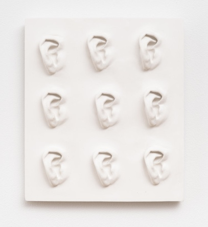 Not all of Mazza’s humor is borrowed. Cast earpieces seem to beseech the viewer to listen more closely, but, because they’re visual renderings, they slyly implore us to look more closely as well.