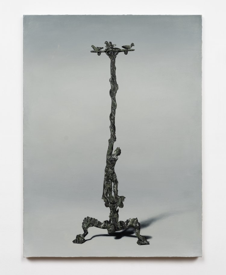 A pair of photorealistic paintings, titled Suthina, round out the main group. These appear to be images of Etruscan tomb sculptures, lending the exhibition elegant gravity. Mazza’s painterly skills are in full evidence here. She has not rendered the paintings in a typically flat photorealist style. Instead, she has used thickly wrought impasto paint that mimics the sculptures’ sinewy metal surfaces, making them convincingly tactile and patinated.