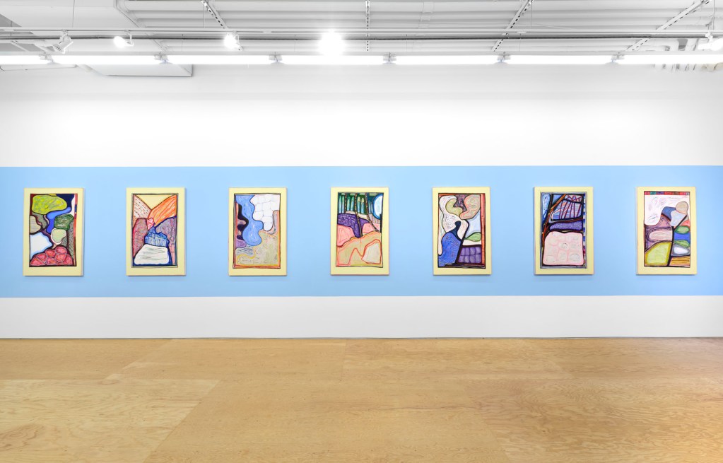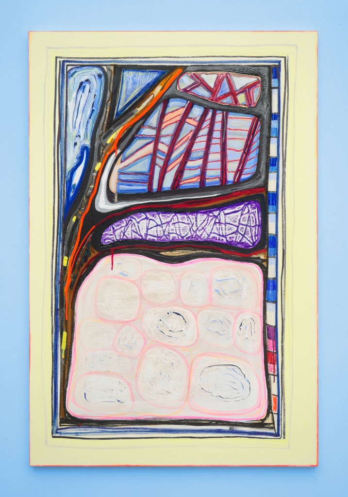 The nine paintings on panels are each framed with a canary-yellow border that brings the eye to heel as it crosses the framing into the works. As a group, the paintings present a tactile interplay of surfaces, incorporating mixed-media elements like diatomaceous earth, gesso, paint, and marker. They also share a simple triad of color, which Hackett tones down to elicit a soft emotive response.
