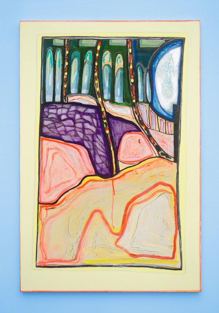Several of the nine introduce schematically sketched sinuous trees that intensify the visual impact of the forms around them. Hackett’s titles tie her work to landscape. Outside Looking In is the most direct, with three trees clearly planted mid-height in the painting with their thin trunks stretching through a high horizon hosting a huge cool moon. In Time Travel Detour, the lean branches of two trees reach towards each other across a barren field of snow. Folding Fields with a Diamond features a white glacial form at the bottom, a blue pool shape in the middle, and orange canyons funneling upward.
