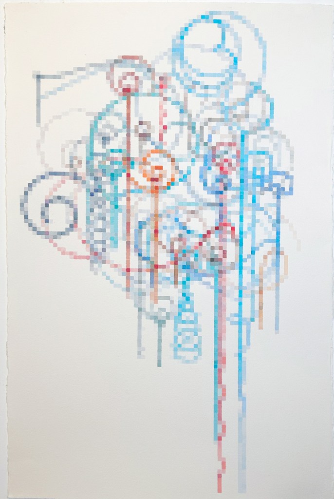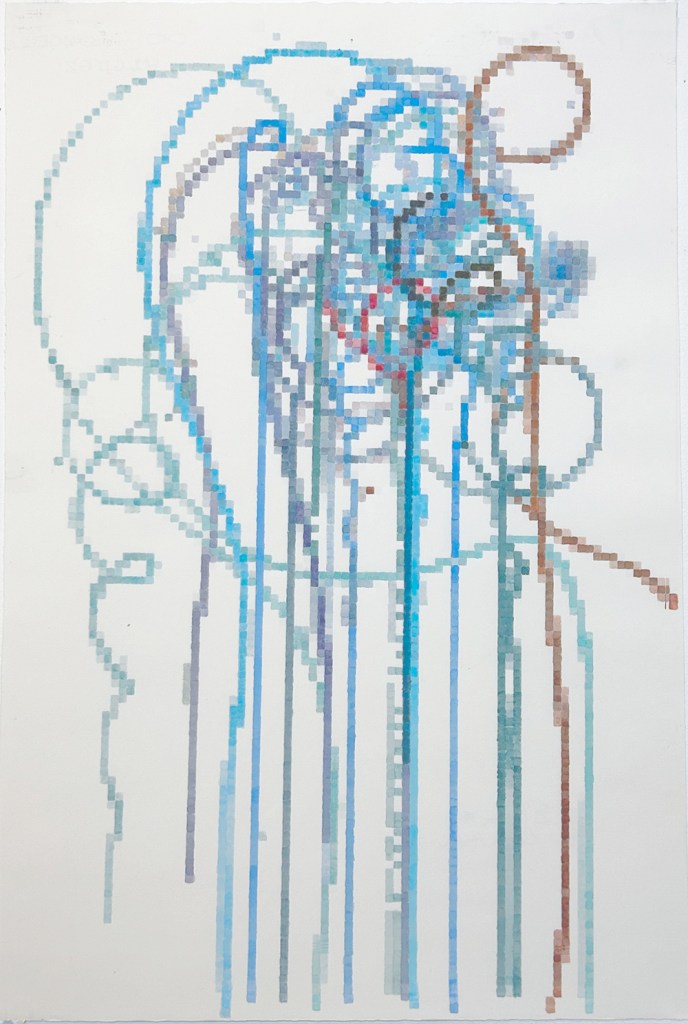 Carter Hodgkin: Since 2004 I’ve used computer code simulating atomic particle collisions to create images. My process is intuitive, like drawing but with randomness embedded in the system. In this series, I’m generating forms with a whimsical, falling feeling. The forms are then translated into watercolor on Arches paper.