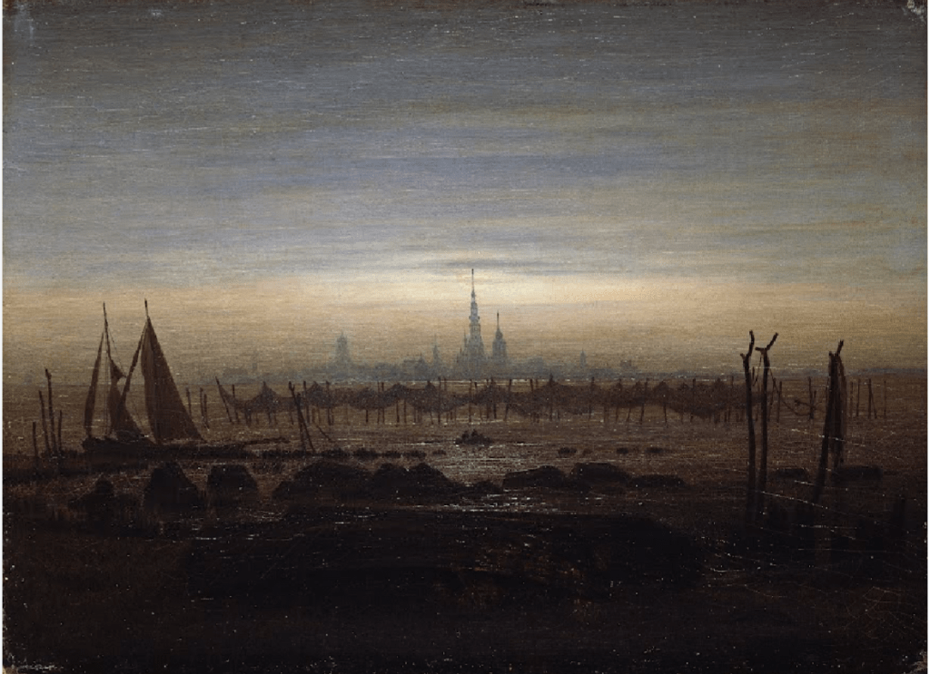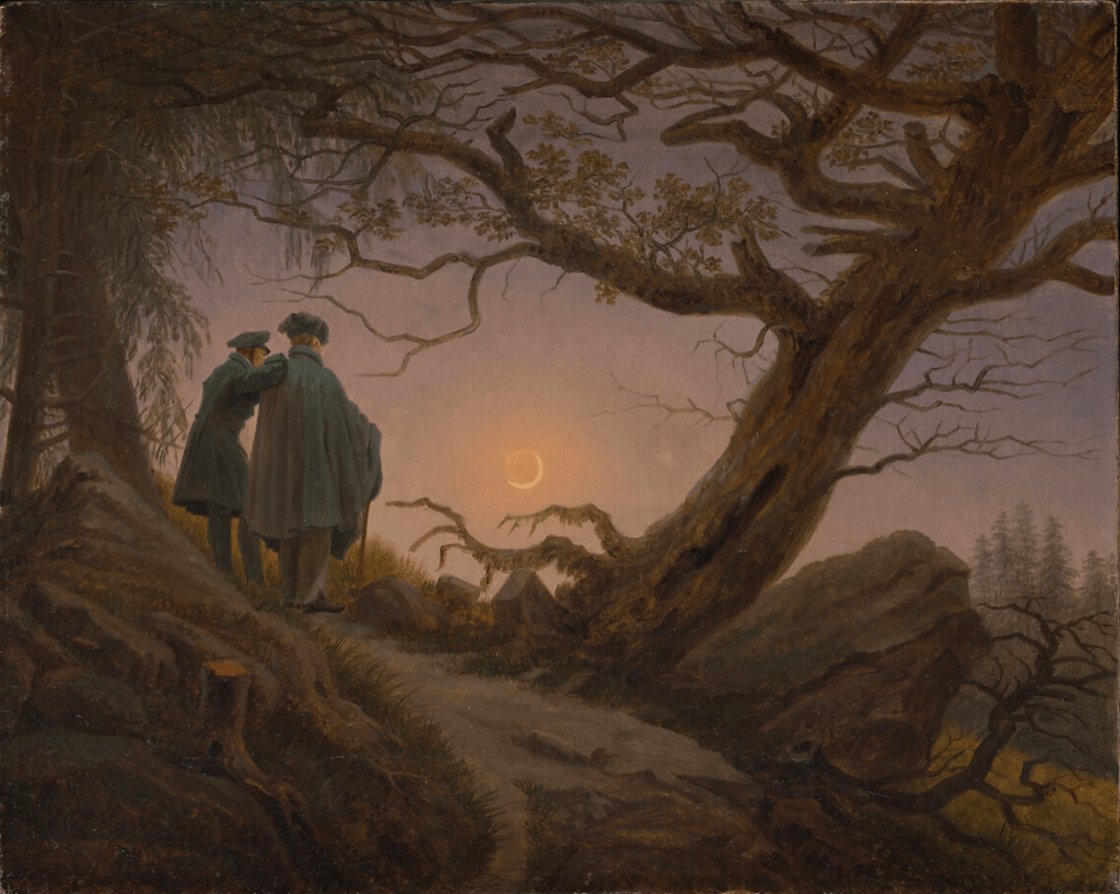 This painting inspired Beckett’s “Waiting for Godot,” which drew upon the playwright’s anxious communications during the French Resistance to Nazism. Though Friedrich left town to avoid the 1813 Battle of Dresden, Beckett would have approved (and Hitler disapproved) of Friedrich dressing the pair (fomenting “revolution,” he quipped) in the “Old German costume” sported by politically progressive students.