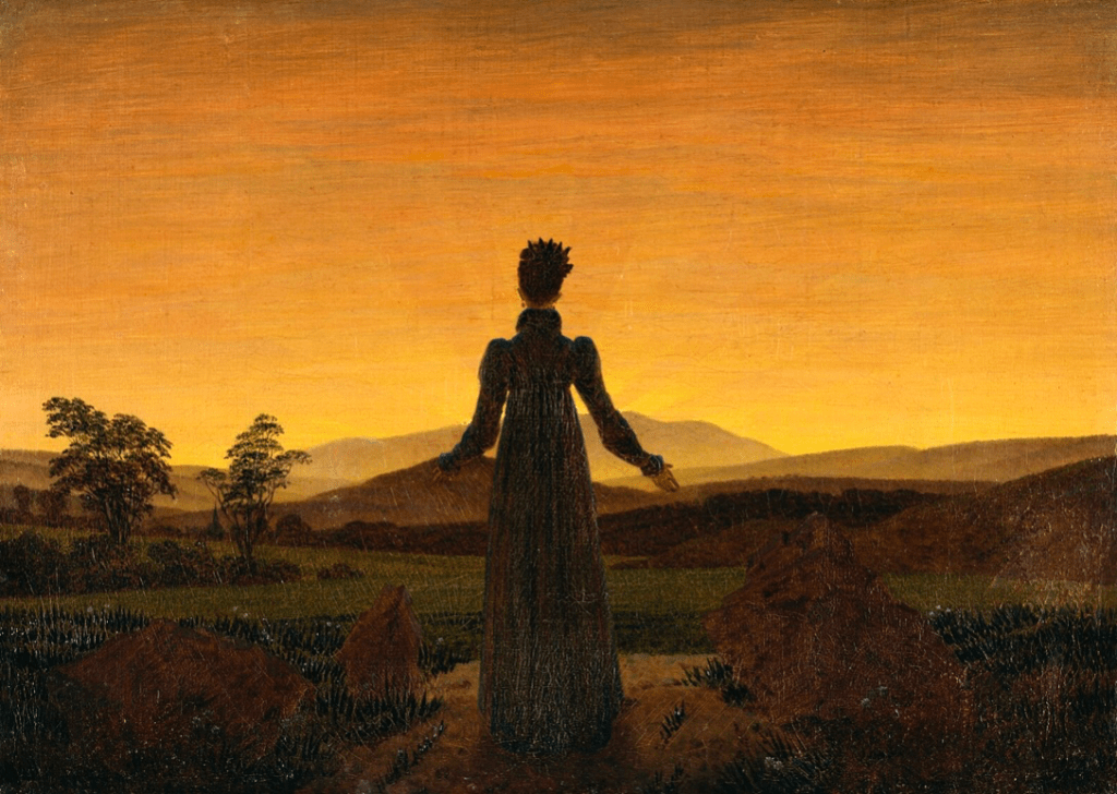 In Woman Before a Rising or Setting Sun, a nearly silhouetted figure stops along a path into an indistinct landscape, arms spread to receive radiant yellow-orange light like an annunciation or stigmatization. Unlike the rear-view figures of Vermeer, Ingres, Hammershoi, Borremans, or Richter, Friedrich’s signature ruckenfiguren straddle anonymity and individual yearning. Caravaggio’s body language employed back views theatrically, leading viewers into scriptural narrative with pantomimed emotion. But Friedrich’s often solitary, taciturn types are in symbiotic rapport with the viewer. Mimicking our position before the painting, they become vehicles, transfixing us with nature’s beauty via his beautiful representation of it. Nebulous meaning invites speculation, recalling Friedrich’s dreamy method: “Sometimes I try to think and nothing comes out of it [so] I doze off and suddenly feel as though someone is rousing me. I am startled, open my eyes, and what my mind was looking for stands before me like an apparition – at once I seize my pencil to draw.” His faceless contemplators would influence the rumination of Bocklin’s Symbolism, de Chirico’s metaphysical painting, and Magritte’s surrealism.