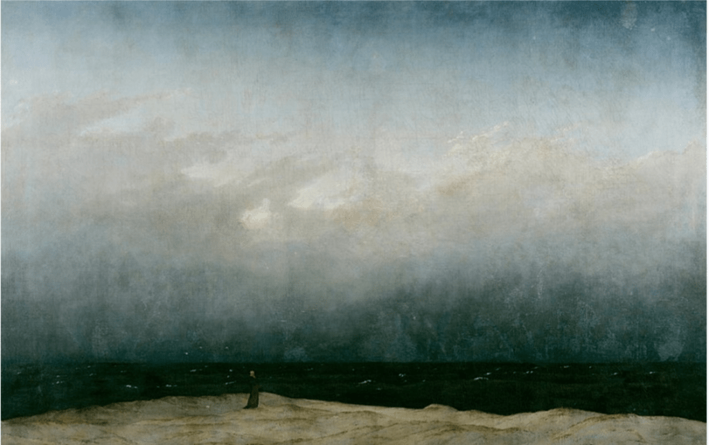 The figure could be based on a local preacher who gave sermons on the beach of the isle of Rugen, one of Friedrich’s haunts. His fair hair may also hint at self-portraiture, possibly in sympathy with the younger Nazarenes, German painters who converted to Catholicism in 1809 and moved to Rome to live like monks. Might it also be in solidarity with real painter-monks Filippo Lippi, Fra Angelico, Francisco de Zurbaran, et al? Friedrich painted outside any protective monastery order or walls, in a world both falling apart and slowly taking shape. In 1806, as the vision of a German nation, spurred by Luther’s vernacular Bible, bourgeoned, the dysfunctional Holy Roman Empire of three hundred territories was dissolved. The Napoleonic Code‘s termination of feudalism and serfdom, and the chaos of mediatisation (ownership transfer of ecclesiastical estates to secular authorities) followed. Could this disoriented monk personify fading Catholic identity, and/or Friedrich’s own lost footing on vague and shifting ground?