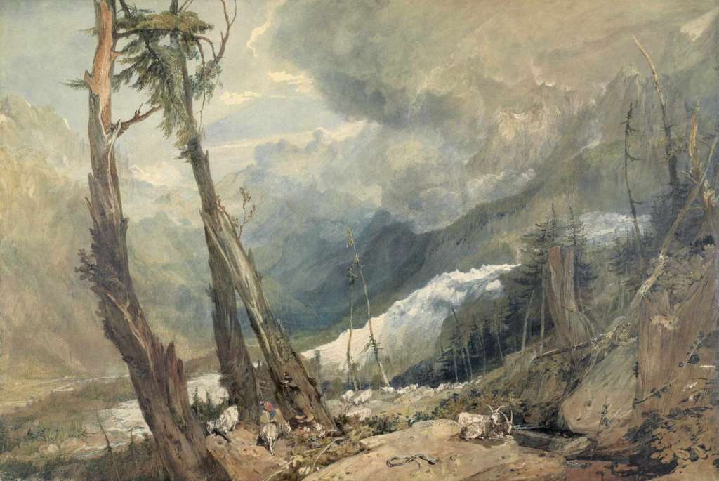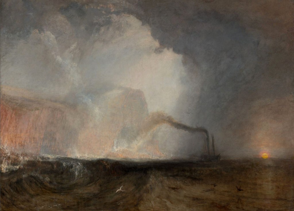 Like most contemporary painters, I was taught that Turner was a precursor to modern art, arguably the first modern artist. His revolutionary move was to replace the serene French classicism of Claude and Poussin with an expressive, sometimes wild, interpretation of nature as a fount of overwhelming beauty and majestic terror beyond human comprehension. Yet many of his paintings contain tiny human figures – tending animals, walking on the shore, at sea, or working on a ship in port – that reveal a keen awareness of the human footprint, and especially the nascent Industrial Revolution. Hence the inclusion of “Reality” alongside “Romance” in the show’s title. Presciently, Turner was interested in what humankind was doing to nature as well as nature itself.