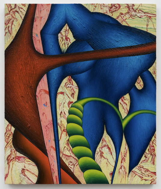 Although decidedly abstract, Victoria Roth’s painting Slither has a muscular funkiness resonant of the form versus figure and plant versus animal contrasts, indecisive yet beguiling, in Jedd Garet’s paintings from the 1980s. There’s a fun, wonky, science-fiction tussle happening, with abundant subtext. Think, for instance, Alien vs. Predator.