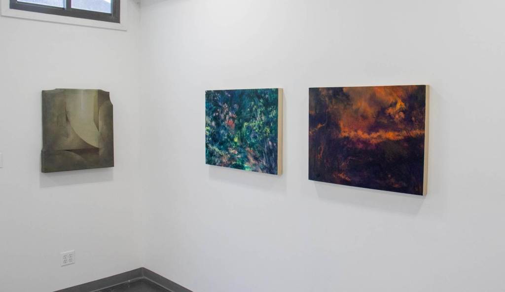 On the opposite wall, an orange haze pervades several canvases, immediately suggesting the new norm of forest fires and their long-range pollutants. This wall begins with a before-and-after diptych from Tracie Lee. On the left is Many Paths, a lush, bioluminescent forest and a moment of beauty. It sets the stage for its sobering counterpart to the right, Respiration and Collapse, which depicts a blazing landscape.