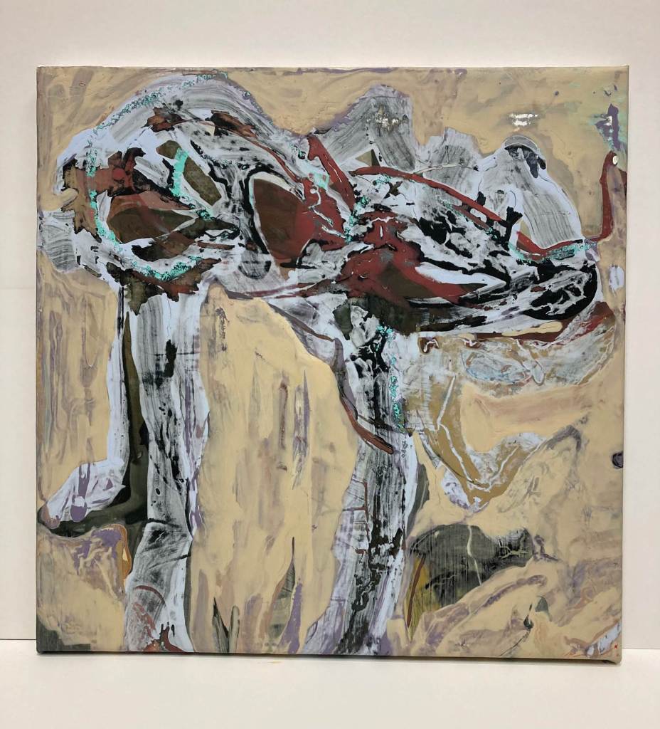 John Fleming’s superb painting – tellingly titled Beetle With The Posture of a Conqueror – provides grounding and identification. In his abstracted view of a quadruped seen from above, a light gray-blue twists over black masses and glistening crimson to render something like the insect’s abdomen. This critter is the show’s strongest figure, its clearest protagonist – perfectly attuned to the end-times theme – and our grim stand-in. From an eerie remove, we see an animal of unnatural coloring distorted, dismembered, and dissolving into its surroundings.