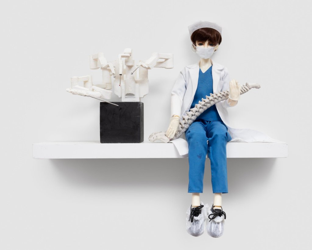 The faces of Anderson’s figures are sometimes blurred or barely formed, as in Real Estate, in which a pair of female figures enjoy a glass of an unidentifiable liquid on a porch – a small drama to provoke thought. Her mother was a stage actress, and she is prone to imparting quietly theatrical structure to her work. Some of her figures are dolls as such, but that doesn’t make them any less affecting and in fact may make them more so by prompting viewers to look harder, à la Brecht. Mary & Mom & Hell’s Angels comprises a Bratz doll in a Catholic schoolgirl’s uniform, a vintage nun doll wearing a habit, and a gnarled mass of metal. In this trinity, the females are intact but threatened by a misogynistic current – the motorcycle club historically having barred women from being “full-patch” members. Surgeon’s very eclecticism – a nondescript doll, a scan of a spine, and a “cartooned” medical machine – underlines the artist’s rejection of any normative ranking of aesthetic components.