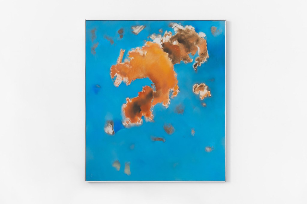 Numerically ordering each work, Gourevitch brings boldness and virtuosity to Cloud Painting #60: Homage to Mondrian’s Red Cloud. Apparently painting with the maximum freedom and speed, she manifests confidence and intensity while conveying the emotional value of a languid summer sunset. In the context of the exhibition, the piece shows that Gourevitch can be a disrupter.