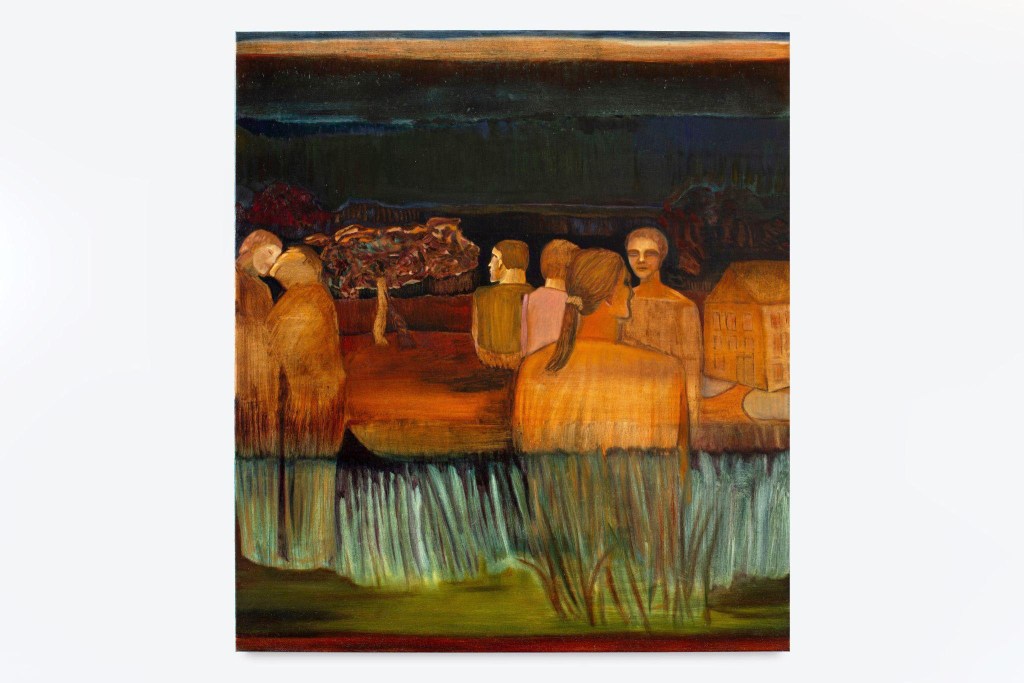 Out of Joint is ostensibly painted from the viewpoint of a man jealous of a couple kissing. The title channels a line in Hamlet – “time is out of joint” – that suggests, per Jacques Derrida, that the past haunts the present and forecloses certain futures. At the same time, the painting has expansive and hopeful aspects. The artist makes deft use of glazes to bring out warmth and a sense of light in what is, overall, a dark and moody scene, and the androgynous cast of the figures suggests a spectrum of gender expression. The vegetation is highly abstracted with simple elegant strokes, implying unearthly status. We know what grass is, but have we seen grass like this? Other worlds are possible.