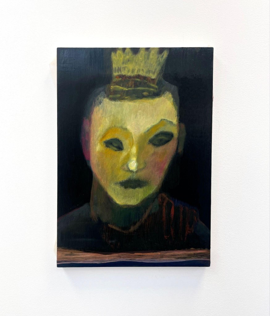 Yet Hachtmann’s work is far from fanciful or ahistorical. Little Prince presents a distortion of anatomical form similar to Frank Auerbach’s in Portrait of Leon Kossoff, painted in 1951. Both works, nearly 75 years apart, reflect the conviction, well expressed by critic Barry Schwabsky, that figurative painting should come from feeling rather than anatomy. This, as both artists show, may entail depicting the figure in a new way. Hachtmann employs less impasto than Auerbach and is more explicitly narrative. But their figures share a melancholy about mortality and fragility, signified by enunciated bone structure – sunken eye sockets or high cheekbones – and balanced against the dignity and resolve indicated by firm posture.