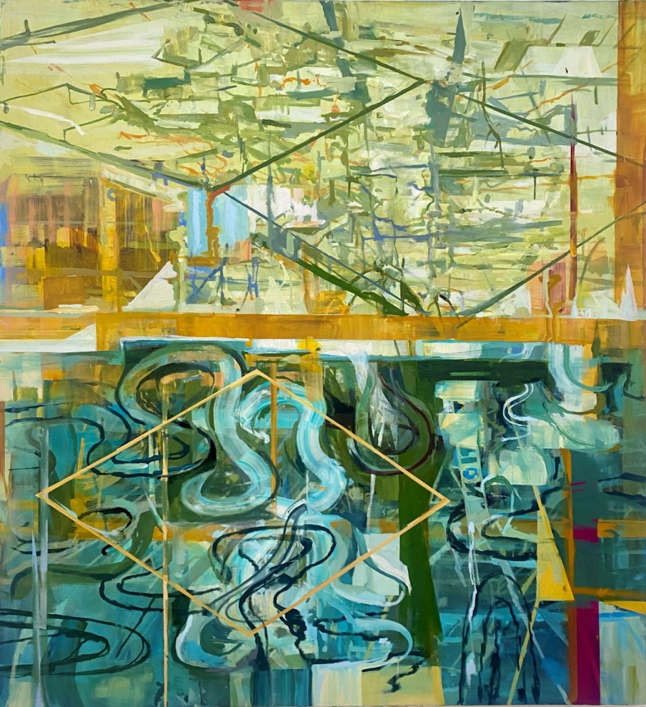 Drought, fire, flooding, and erosion are transforming the mountains, coastlines, and canyons of familiar and cherished vistas. For Thibeault’s latest paintings, source images have included photographs of locations altered by such climate-related traumas. Her overall compositions consistently allude to states of collapse. As I wrote a decade ago, “jangled, saturated color, buckling architectural forms, shifting landscape spaces, and jittery brushwork give visual form to the artist’s anxiety.” The pandemic has only sharpened her sense of alarm. Yet Thibeault controls and stabilizes the visual intricacy of her paintings with atmospheric color fields that bind each work into a cohesive whole and establishes, as she has put it, “tension between instability and balance, breakdown and recovery.” The layered visual webs of imagery bridge different time periods and places, embodying the complexity of human experience as well as environmental pathways.