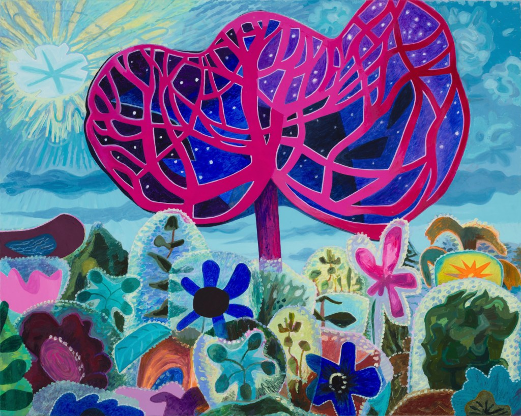 In the paintings, Carson favors a technicolor palette and a style that nods to a 1960s Disney-esque childhood. Teeming landscapes, mutant and fecund, are blossoming perpetually in a neon season of raucous retro-futurism. There’s an urgency to this work, a vivid, original language that has evolved from a variety of sources. Carson studied in Chicago in the 1970s and her time there seems formative. She cites Elizabeth Murray as an influence, and the high contrasts, patterns, and funky surrealism of Chicago Imagism also comes to mind. Mark Rothko’s surrealist work, Cubist collage, Charles Burchfield’s visionary landscapes, plus the experience of creating her own renowned garden have all been revelatory for her.