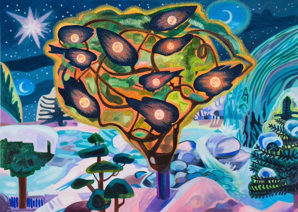 Nocturnal Hijinks highlights Carson’s reversals of natural norms. The night sky is filled with stars and crescent moons under a blanket of snow, pink with moonlight. In silhouette, the tree’s canopy is lit, perhaps irradiated, with pointillist patterned dots. Its branches sprout giant leaves, or windows, filled with stars and moons. Surreally poignant, the tree portends its own universe. Behind it, in teal and lavender, is an idyllic landscape, including topiary recognizable from Carson’s personal garden. It’s a quiet and reflective “what if” proposal.