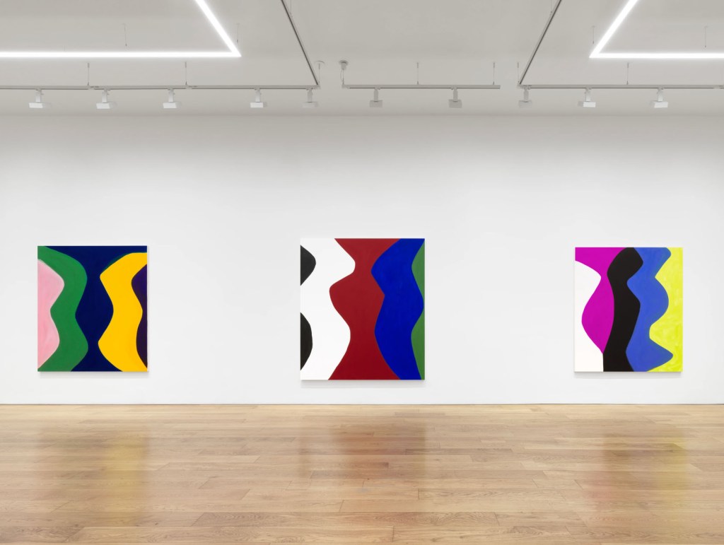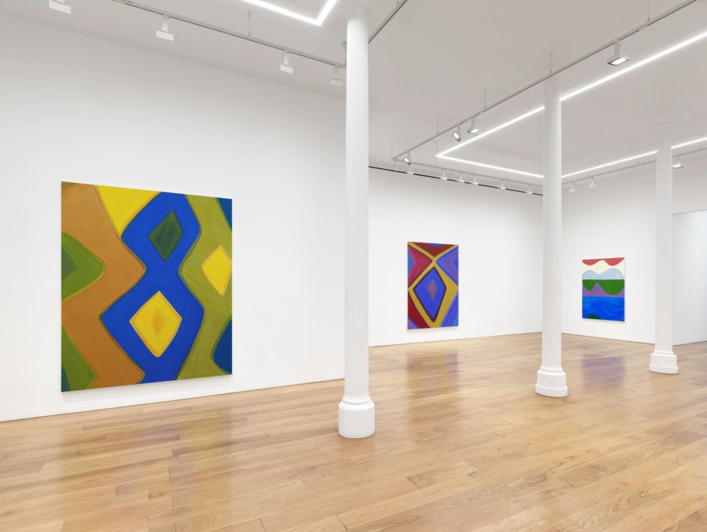 Contributed by Amanda Church / Marina Adams has long been exploring the range of allusions that can be conjured by various color combinations and the scale and placement of simple shapes, which press up and vibrate against each other in subtle, sexy ways. Curvy configurations, interspersed with diamonds and triangles, hint at myriad aspects of nature and the female form. In Adams’ current show “Cosmic Repair” at Timothy Taylor, variations on this trajectory continue in nine paintings, all new and acrylic on linen except Singing to the Highest Deity from 2020 hanging by itself in the back room. Influences range from Matisse to, according to the press release, “Uzbek textiles, Indigenous American Southwest pottery, and the Great Pyramids.”
