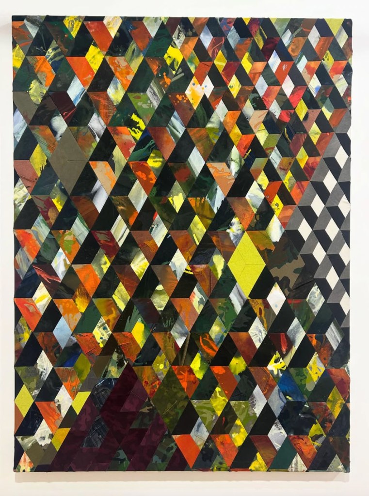Jonathan VanDyck’s Coming to a Head similarly begins with worn clothes but moves on to portray the history of art as the homogenization and disciplining of human bodies. Denim and twill pants, once conformed to living bodies, are cut into parallelograms, sewn together, painted, dyed, and stretched on bars. From a distance, the piece reads illusionistically, like a grate or screen. Up close, the seams, pockets, and faded fabrics, rubbed thin and faded where bodies once pressed, recast geometric abstraction as a narrative of containment and dehumanization. Abstraction, in VanDyck’s hands, no longer floats above history but is grounded in the human experience of being embodied.
