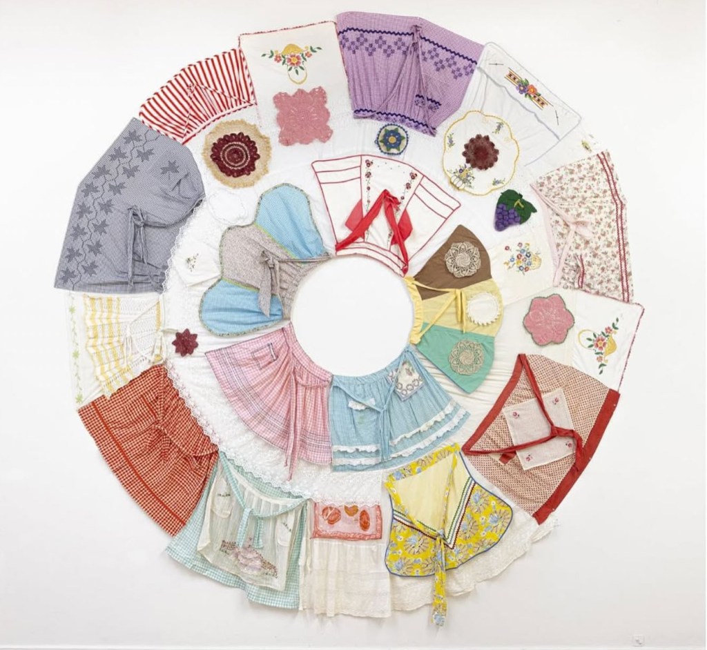 Patricia Miranda’s A Round of Roundes II suggests that art begins with an individual’s impulse to make life beautiful, as expressed in the vintage handmade doilies and embroidered aprons that Miranda has collected, archived, and pinned together into a monumental circle. The piece becomes a collaboration of all those women, most no longer alive, who spent countless hours designing, decorating, mending, and cleaning these objects. Their aesthetic impulses, once limited to the domestic sphere, now, in the gallery, take their place as fine art while retaining the intimacy and humility of individual labor.
