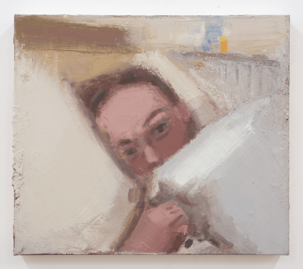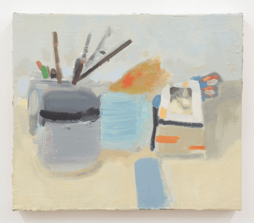 Several still lifes are included in this show: artist supplies on a table, a plant by a window, clothes drying on a fold-out rack. The worlds Shea captures are mostly self-contained, with the subject centered on the canvas. The exception may be the most striking of the paintings. In Studio Mirror, Still Life, a rectangular mirror sits on a white wall. In the mirror – thus “behind” the viewer – is the opposite wall. Against it, on a table, is an assortment of artist’s supplies and materials. The matte white bottle sitting in the middle could be one of Morandi’s if not for the conspicuous black cap. A couple of small paintings stand at the back. Two more works hang high up, almost out of view, near a yellow polygon we can tell is a pair of gloves only from the shadows they cast on the wall. The mirror is truncated on one side by the edge of the canvas. The array suggests creative endeavor through steady routine, some of it cut off from view.