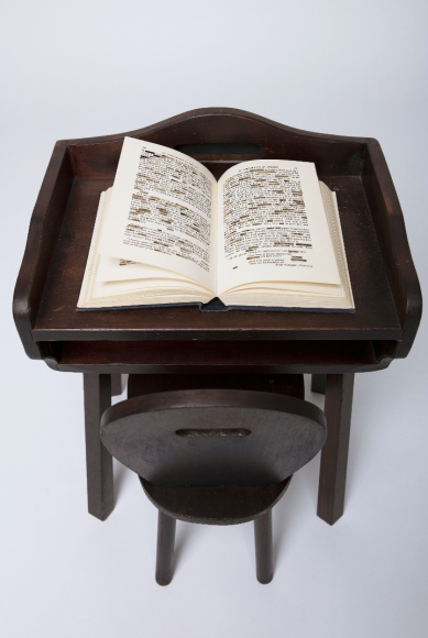 DH: Here’s my other thought about the word interpretation. You have a copy of Sigmund Freud’s book Interpretation of Dreams pinned high on the wall by a long rod attached to the floor. One of the things Freud gets at in that book is the idea that there’s a manifest content and a latent content in dreams. The manifest content is that I’m being chased or whatever – the subject matter of the dream. The latent content is the thing that free association and hopefully some interpretation can reveal. Perhaps your process of taking a text and burying it, making it unreadable, is a way to return that manifest content of the text, Moby Dick or Freud’s dream book let’s say, into a state of latency.