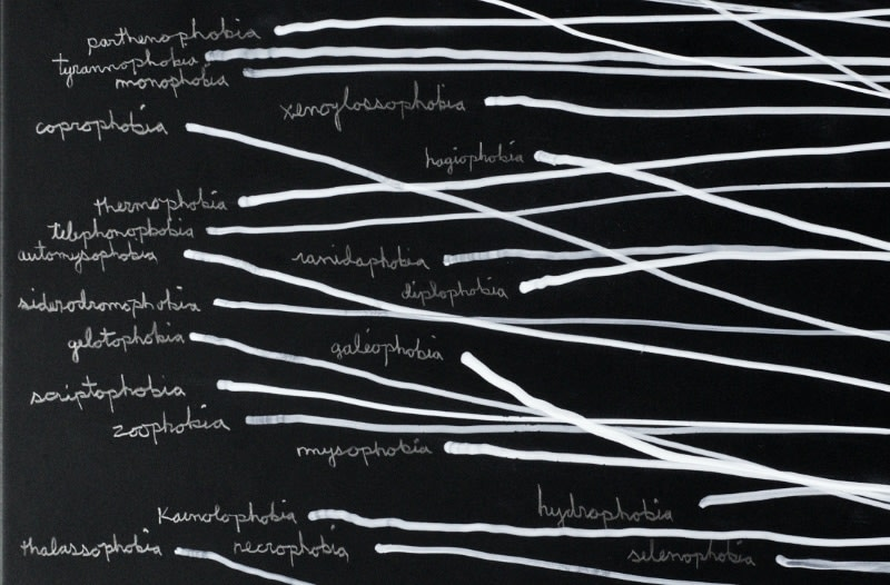 The left panel holds a definitive list of clinical phobias (detail above), the right panel lists the fears themselves.