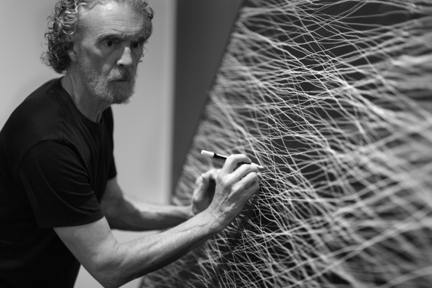 GG: Yeah, as a clinician. And I did, and it’s breathtaking. This work is very thoughtful; it’s a concept, very idea driven. The blabbering in my mind is going on all the time and there’s a kind of madness there. In the psychedelic work, clinically, there’s a thing in the brain called the default mode network. The default mode, is where we have our stories, our interpretations: I was born here: i’m this color, I’m this gender, these are my parents. It’s a story. We live our lives as though that’s the truth. It’s a burden or it’s a joy. Psychedelics takes that offline so that you’re just dwelling in an immaculate sense of clean consciousness. Your heart experiences what it’s like to be free of this story that has become a burden. You have a somatic experience of what it’s like to be free of that. You emerge from the experience to do your work and hopefully grow with more freedom in your life. When I was doing these drawings I found doses that were just enough to take the default mode network offline but not make the walls melt. I’m in a betwixt state with language disabled. I’m not trying to make a drawing. They just came out without intention.