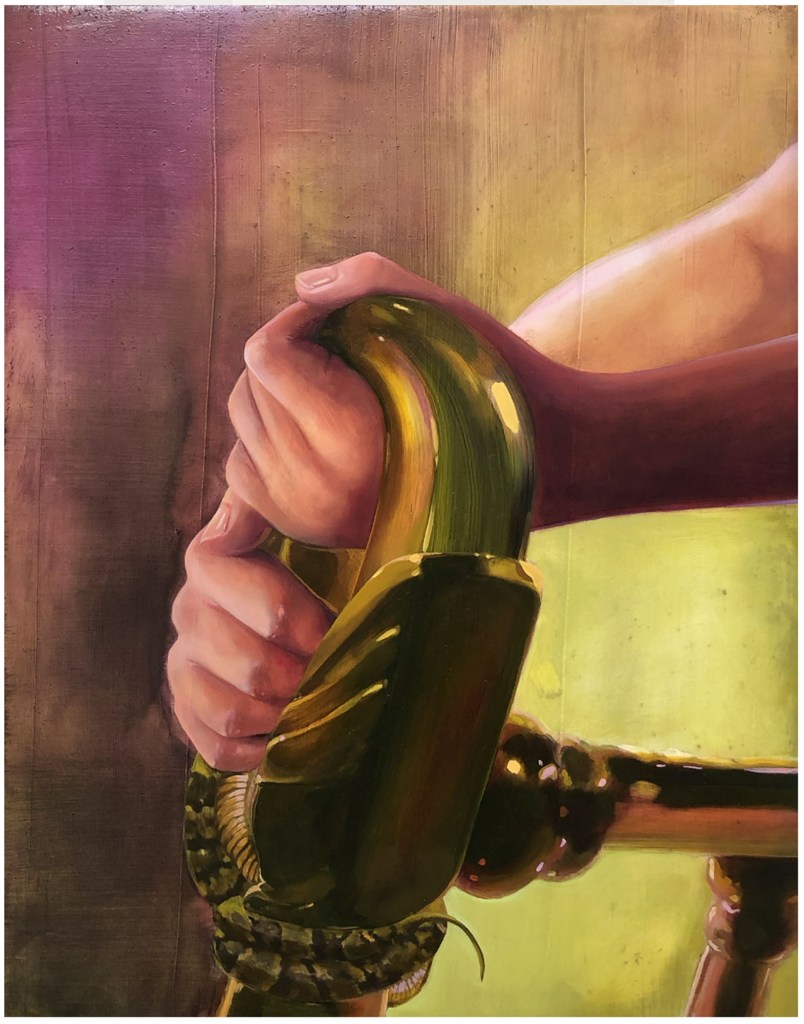 Directly to the right when you walk in, Sharper Than a Serpent’s Tooth is an early win. Two hands grip a looped, golden bed frame. Under the hands is a snake’s tail, the patterning resembling a ball python or some other constrictor. Constrictors are ambush predators that wrap around their prey and squeeze the life out of them. They are also, traditionally, bringers of knowledge, the devil’s servants, or symbols of transformation. This painting, devoid of scene or background, is pure struggle playing out in bruised washes of acidic green and purple.
