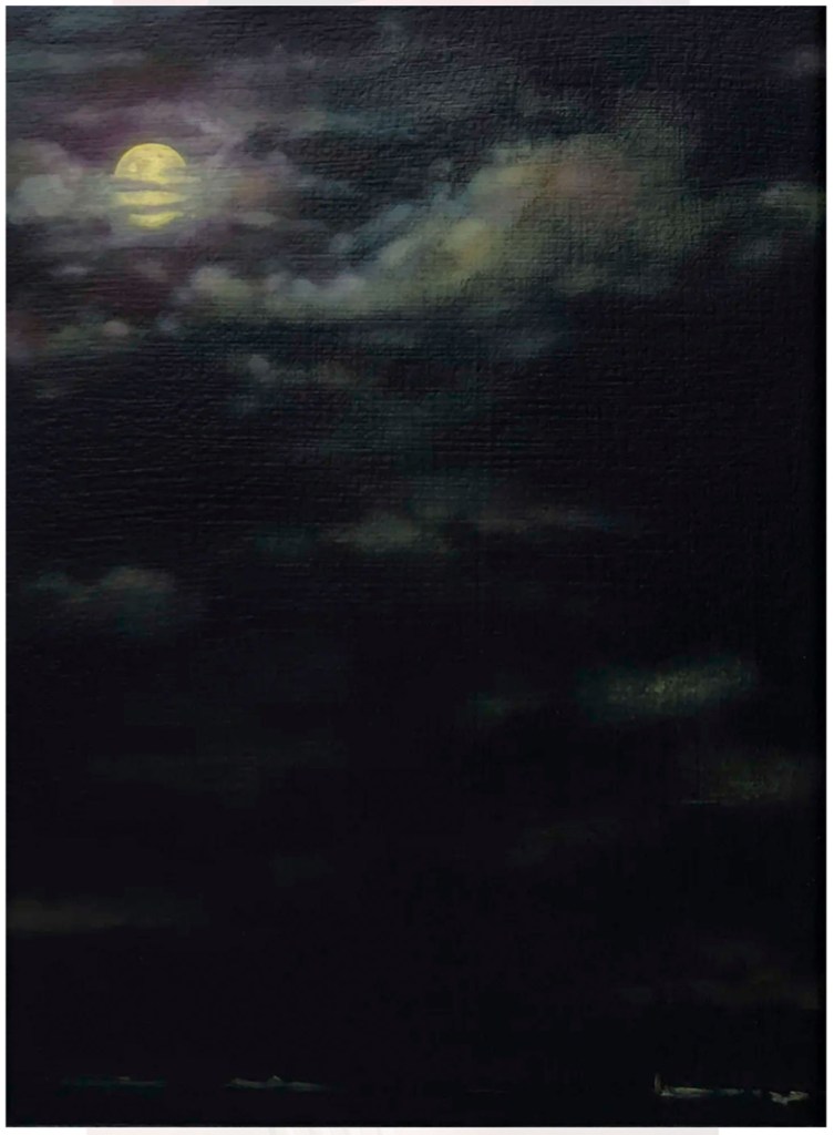 There are other successes in the room. In Pinned, a hand grips a wrist and holds an unseen body to the ground. The line between aggression and sexuality is blurred. Where this is happening is not clear, but judging from the red gradient behind the hands, it could be hell. Chandelier looks like a Ross Bleckner through night-vision goggles, too small for a big brush but crowding all the dread and morbidity of the 1980s into an 8 x 8-inch canvas.