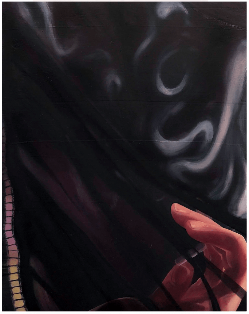 Contributed by Jacob Patrick Brooks / Auxier Kline is a small hallway gallery on the fringes of Chinatown. Alexandra Smith’s previous shows there had an intimate sweetness – tender images of touch, flesh rendered in unnatural pinks and yellows, hands everywhere, faces rarely shown. “Doppelganger,” Smith’s current show in the gallery, turns into darker territory. Overall, the mood is creeping dread – a sense that “something bad is going to happen, probably to me.” Monochromatic and sceneless, the paintings evoke at once the feminist bodily awareness of Joan Semmel and the highly stylized misogyny of Italian giallo. The tension runs through the work, zipping around the room.