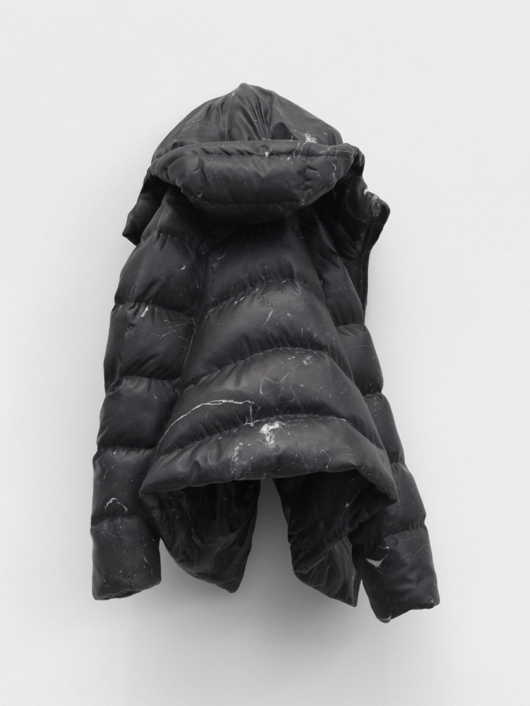 In her marvelous books, Anne Hollander, explains, for instance, how Titian captured the sumptuous Venetian fabrics of privileged sitters. His work, of course, is a long way from Saban’s. But about a decade ago, Joachim Pissarro and I published two books on what we called “wild art.” We were interested in the variety of worthy artworks which, for whatever reason, were not taken seriously within the gallery and museum worlds. Why, we asked, were food art, graffiti, and tattoos not accepted alongside paintings and sculptures? To the many examples we gathered I would add Saban’s. Earlier I had apprehended the puffer jacket at the entrance as just an incongruous garment. In fact, it’s a hi-tech carving Saban made from marble. “Flowchart” is a great show, boldly imaginative and philosophically sophisticated, enlarging our visual thinking and our awareness of the aesthetics embedded in the world around us.