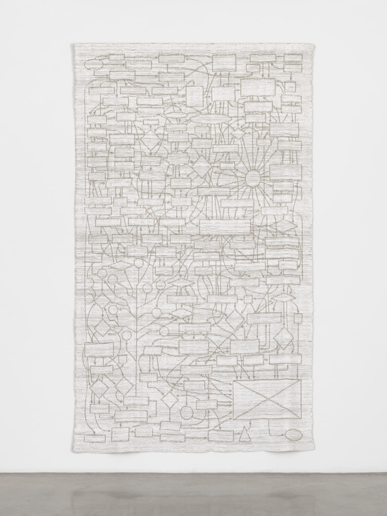 Contributed by David Carrier / Arriving at the Tanya Bonakdar Gallery, I was surprised that someone had hung a puffer jacket on the entry wall. Such galleries are usually immaculate. I walked on, for there was a lot to see in Analia Saban’s extraordinary show “Flowchart.” Upstairs, Core Memory, Plaid (Black, White, and Fluorescent Orange), a woven paint construction on a walnut frame, visually alludes to both weaving and magnetic-core random-access memory, a building block of early computing. In the downstairs gallery, five large tapestries picture playful flowcharts – hardly the traditional subjects of woven art – that marry the handmade and the digital. The next room contains 18 Studio Notes, graphite-on-laser sculpted notebook paper reflecting Saban’s working processes in geometric patterns and miscellaneous doodles. Yet just as I do not understand the inner workings of the computer on which I am composing this review, I didn’t know exactly how Saban constructed her very varied designs. Nevertheless, they enchanted me.