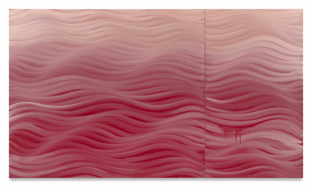 Contributed by Amanda Church / Conjuring The Cure’s 1987 song Just Like Heaven – which proclaims “you’re just like a dream” – Karin Davie’s eight new large-scale paintings on view at Miles McEnery Gallery, all oil on linen, transport us to a realm of sensation and association. Here her wavy imagery, which she has been developing in one form or another since the 1990s, immediately evokes the swells and dips of the ocean’s surface as well as recalling the fluid lines essential to the work of painters like Sol LeWitt, Brice Marden, Bridget Riley, Moira Dryer, and late de Kooning, albeit to varying effect. Davie’s version consists of smooth, sensuous brushstrokes that make paint behave in almost magical ways. Their twists and turns, muscular with curvy bulges, also come across as somehow delicate and feminine. Landscape and portraiture, mind and body, space and time – all are activated through the compression and release of Davie’s mind- and space-bending forms.