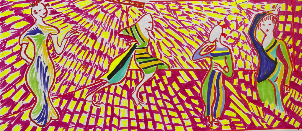 SS: GRIFTER’s Gambit has elements I don’t think you have used before. The narrative is affixed to a musical score, becoming a libretto. Do you feel that the content is altered in any way by this? Are the phrases we see on the walls in all those luscious colors meant to narrate, or rather to be seen as symbols or signposts pointing us in a direction without necessarily spelling out a position?