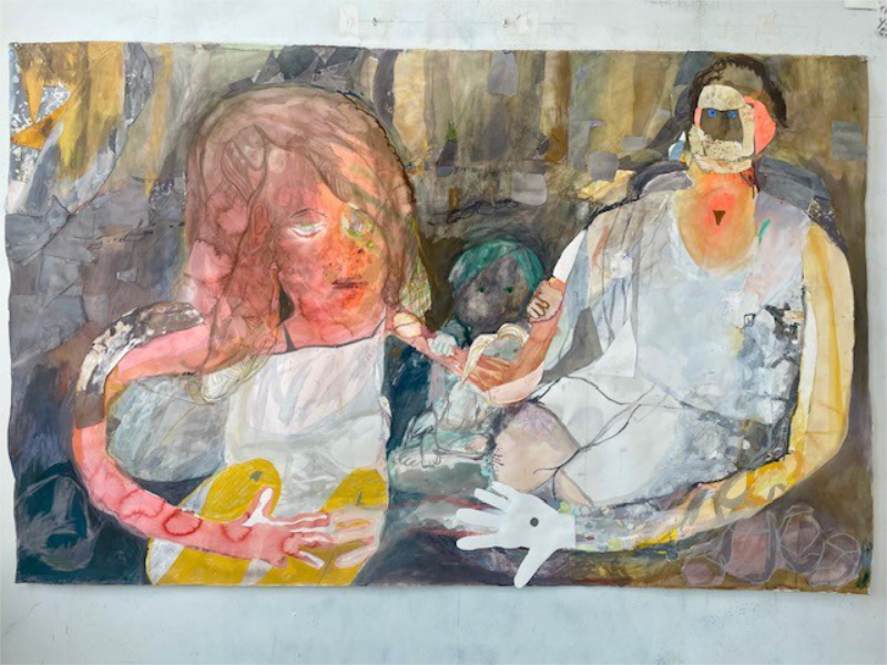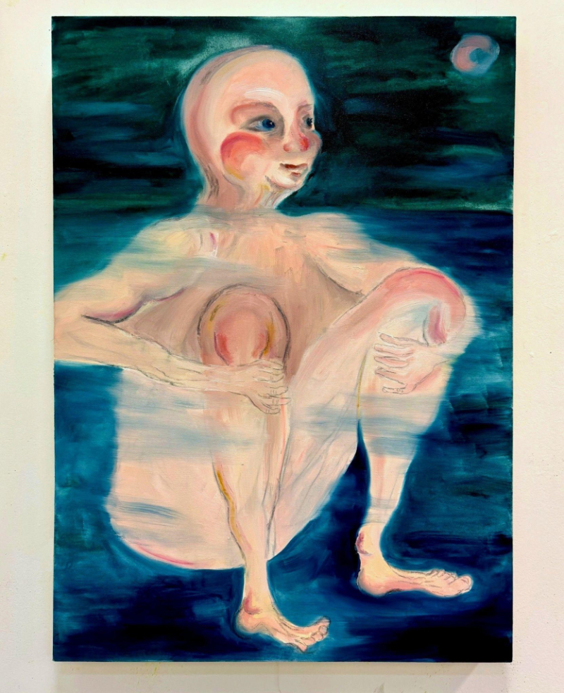 Karin Campbell’s large mixed-media collage resembles a dark, watery puddle that becomes the stage for a family portrait: elongated arms and stitched faces awkwardly embracing. One figure, holding a carving knife, stares out, the brownish-pink face marked by wandering strands of hair, while two children hover in a moral tug-of-war over whether to prevent or assist in the butchering of the other parent. Her second work, a small oil on canvas, depicts a suspended ghost figure with an orange-pink aura streaked with teal and violet, hovering over an indigo field. These pieces feel indebted equally to Marlene Dumas and Katherine Bradford.