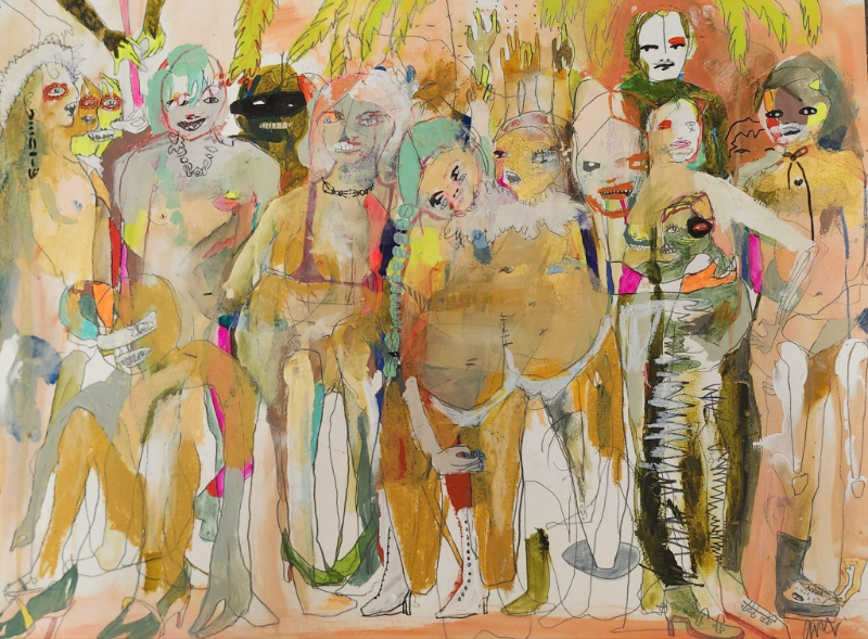 Amy Morken’s works on paper feel like a carnival parade of clowns with smeared makeup, bodies and limbs tangled in chaotic motion. The frenzy recalls early Pollock, though the sensibility remains rooted in illustration like Warhol’s commercial shoe drawings.