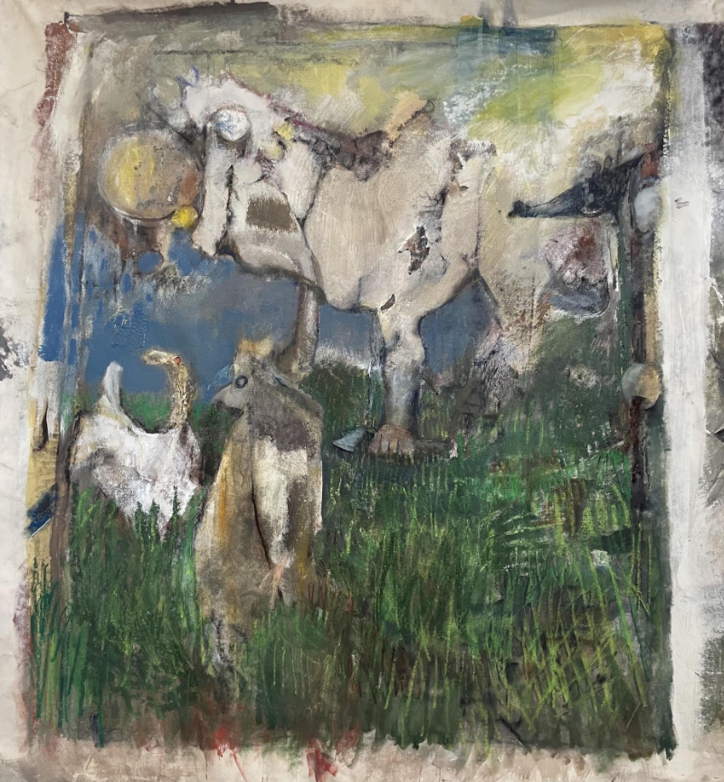 Carlisle Burch’s paintings present architectural lines and monoprint transfers boxed out like trap doors to another dimension. Lauren Tsipori’s unstretched tapestry Still Got That Dog in Me is gothic-pastoral scary, with animals that look like contorted figures from an Arshile Gorky landscape beneath a stained, moody sky. The show’s lone sculpture, by Matt Richards, is a zany collection of spindly green forms resembling extruded Play-Doh. Whatever it is, it’s not from this planet.