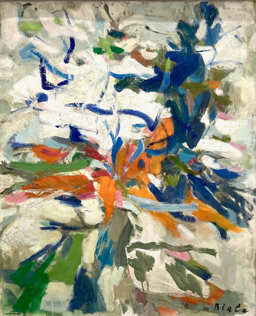 Capturing the growth of a tree in springtime, Biala’s Arbuste au Printemps situates us at ground level. White brushstrokes incised with sgraffito suggest wind or sky as limbs and leaves swirl and twist. This work has a cousin in Joan Mitchell’s monumental Hemlock. Mitchell and Biala were colleagues in Paris, but Biala retains the ground plane, with gravity anchoring her subject, whereas Mitchell’s “whiplash lines” become a purely abstract forcefield, independent of an earthly horizon.