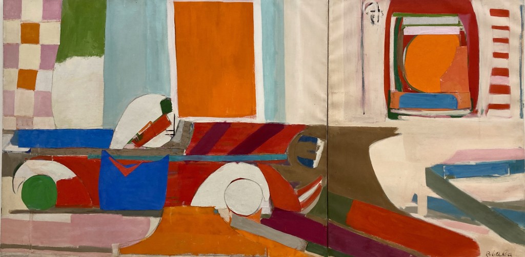 Contributed by Rebecca Allan / Just off rue de Jarente in the Marais, Galerie Pavec – which late last year presented “L’Esprit Français,” the first Paris solo show of the paintings of Janice Biala (1903–2000) in 38 years – is tucked into a gated courtyard, through an enfilade of terracotta containers holding leafless trees that stretch toward sunlight. On a crisp November day, they brought to mind William Carlos Williams’ “alphabet of trees … their crossing bars of thin letters that spell winter and the cold.” Panes of a mullioned window bent wavelengths of red-orange, robin’s egg blue, and emerald green. Inside, Biala’s paintings conveyed the experience of wandering through passageways, from the jostle of the street to the intimacy of a home.