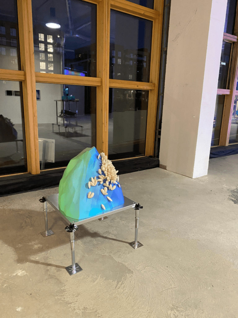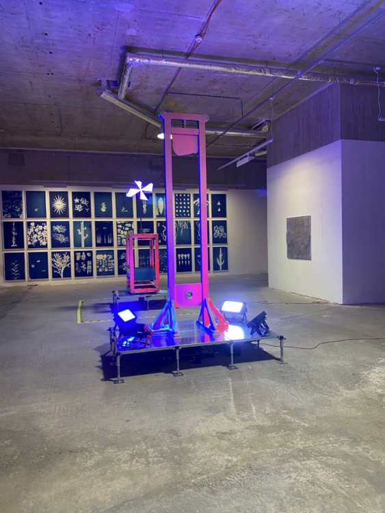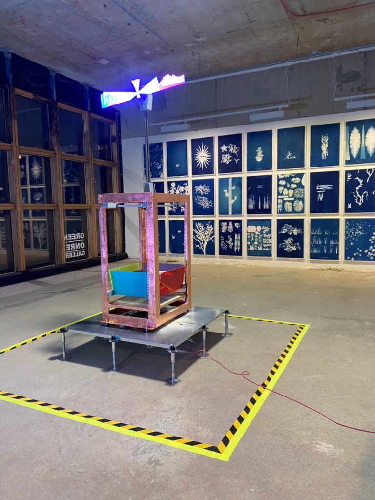 In Vanitas, one of the sculptures in the middle of the gallery, a tall painted vertical structure that looks like a guillotine is bathed in blinking lights. It is attached to a live data feed, and every time a big tech stock loses or gains a million dollars, a drum beats. While I was there, the drumbeat was non-stop, the way a bell buoy responds to the waves on the ocean, clanging for each one. In Cyanotype 33, a more traditionally rendered piece, digital plant images found in video games are subjects of a floor-to-ceiling installation of cyanotype prints that recapitulate pioneer photographer Anna Atkins Photographs of British Algae: Cyanotype Impressions, from 1843. For Ghost Mussels, 3-D printers have rendered perished mollusks into sculptures. They function as contemporary fossils, honoring the lost creatures while at the same time creating permanent synthetic versions of them. Thanatophone, a tabletop piece comprising several electronic gadgets, is decidedly more analytic. Ituses GPS satellites to locate itself on Earth while pulling in real-time weather data to identify the hottest global locations, cross-referencing the coordinates to locate critically endangered plants nearby. Computer-vision algorithms convert plant images to sound, played through a long-range acoustic device’s speaker, and sketch the endangered species on a laboratory oscilloscope within the sculpture.