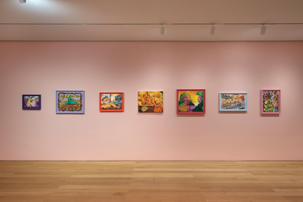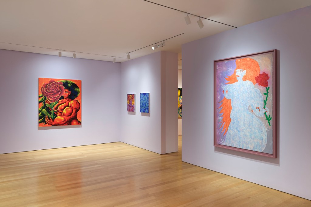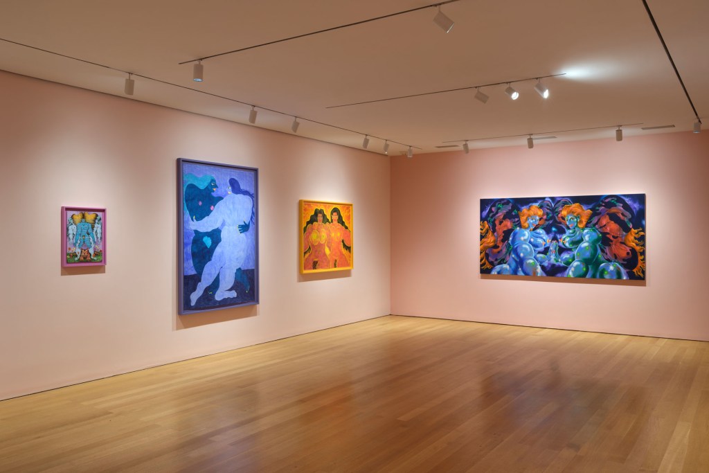 Benaroya cheerfully breaks down the gaze, exposing non-binary strains in insistently male-driven social constructs. Upstairs are pastel-colored walls, each room a different color. The first work is The Great Reveal – a mirrored image of two women confronting the audience, one glaring and the other smirking, as if to taunt. While the skin of bodybuilders and wrestlers invariably reflects a deep tan, Benaroya renders them blue, red, and orange, leaning into the subject’s comic-book vibe. At the same time, there is an air of coolness in her figures that makes you want their approval and friendship.